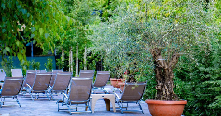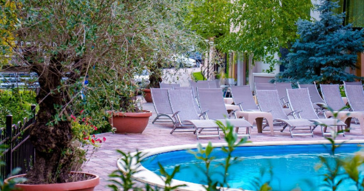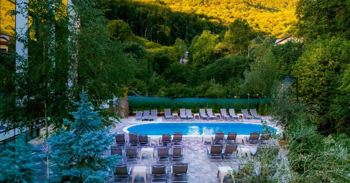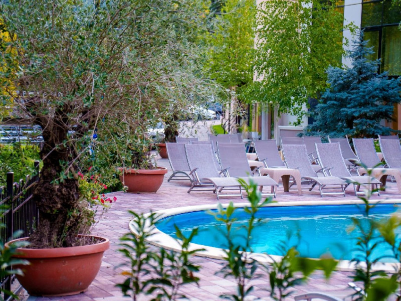 Hotelul dispune de o piscina exterioara ce contine apa geotermala (temperatura apei fiind de 35 grade C iar adancimea piscinei este de 1.4m). Apa provine de la unul dintre izvoarele termale, apa incalzita in subteran de activitatile geotermale ale pamantului, bogata in saruri, minerale si dioxid de carbon. Apa termala contine minerale precum calciu, sodiu, potasiu si magneziu, minerale incluse si in factorul natural de hidratare, o componenta ce asigura hidratarea pielii. In sezonul cald, piscina dispune si de o terasa exterioara, unde turistii se pot delecta cu bauturile si preparatele preferate. PIZZA / BURGER / GRILL / SALATE.