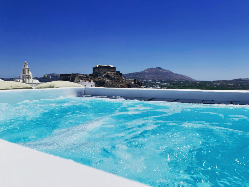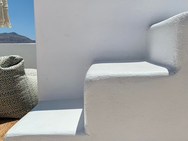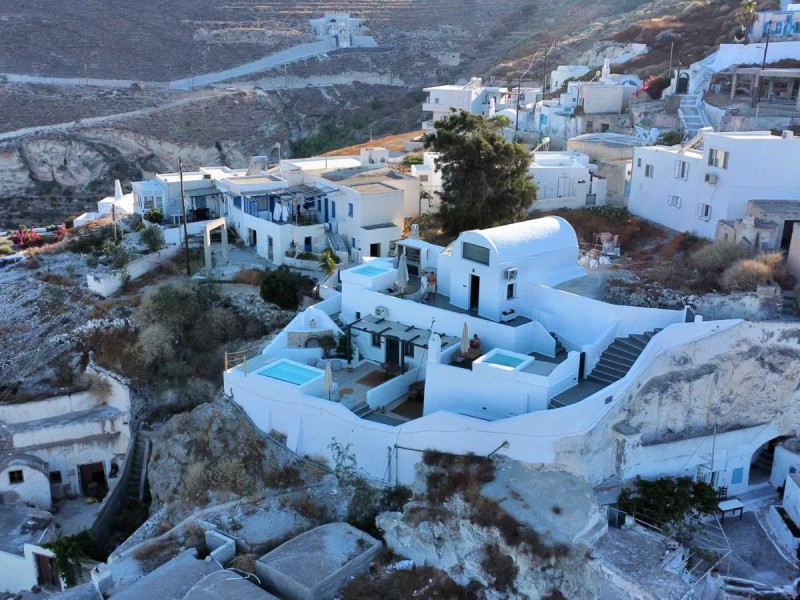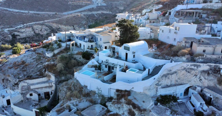 4 traditional suites at the top of the traditional settlement of Akrotiri overlooking the Goulas (castle) of the village, the caldera and on the other side the mills and the red beach. 3 suites in the form of a cave & 1 villa newly built on an elevated point.